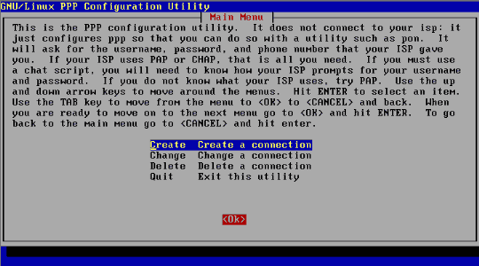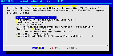 Wie ein Modem physisch an den Rechner angeschlossen wird, wurde im Kapitel Systemadministration Hardware-Installation besprochen. Der Schwerpunkt im folgenden Text soll nun auf die Einrichtung eines Zugangs über einen Internet Service Provider (ISP) liegen, also die Schritte der Konfiguration, um mit einem simplen Befehl oder Mausklick den automatischen Zugang zum Internet aufzubauen. Debian: pppconfigPPP? ProviderName, DNS, Protokoll, dann USername bei ISP, Passwort, Baudrate , Pulse oder Tonwahl, Nummer des ISP, Automatischer Test, wo Modem hängt. Nochmals Zusammenfassung und Möglichkeit der Änderung der einzelnen Einträge